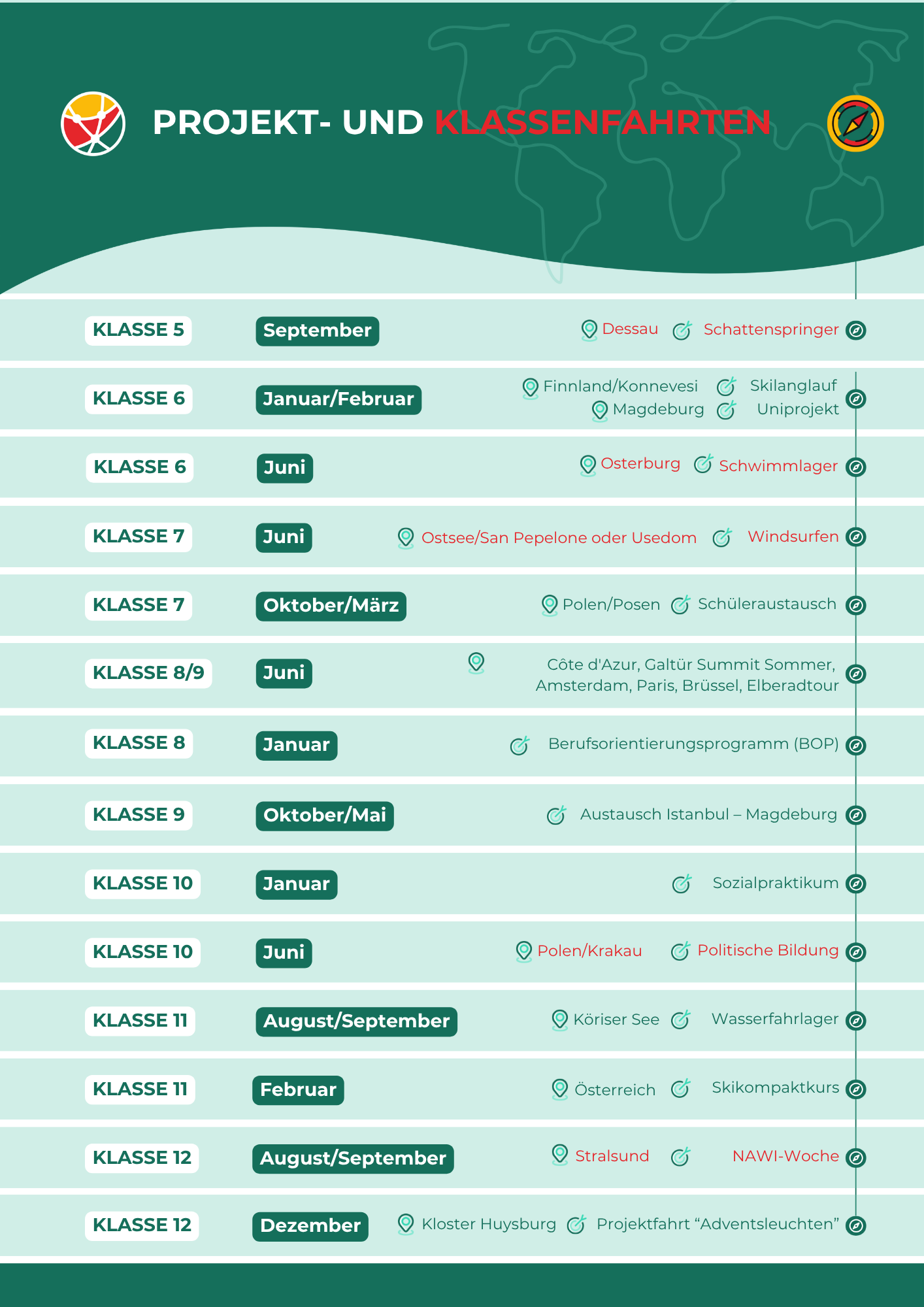 Bei Fahrten in den Klassenstufen 5, 6, 7, 10 und 12 handelt es sich um verpflichtende Klassenfahrten (rot markiert).
